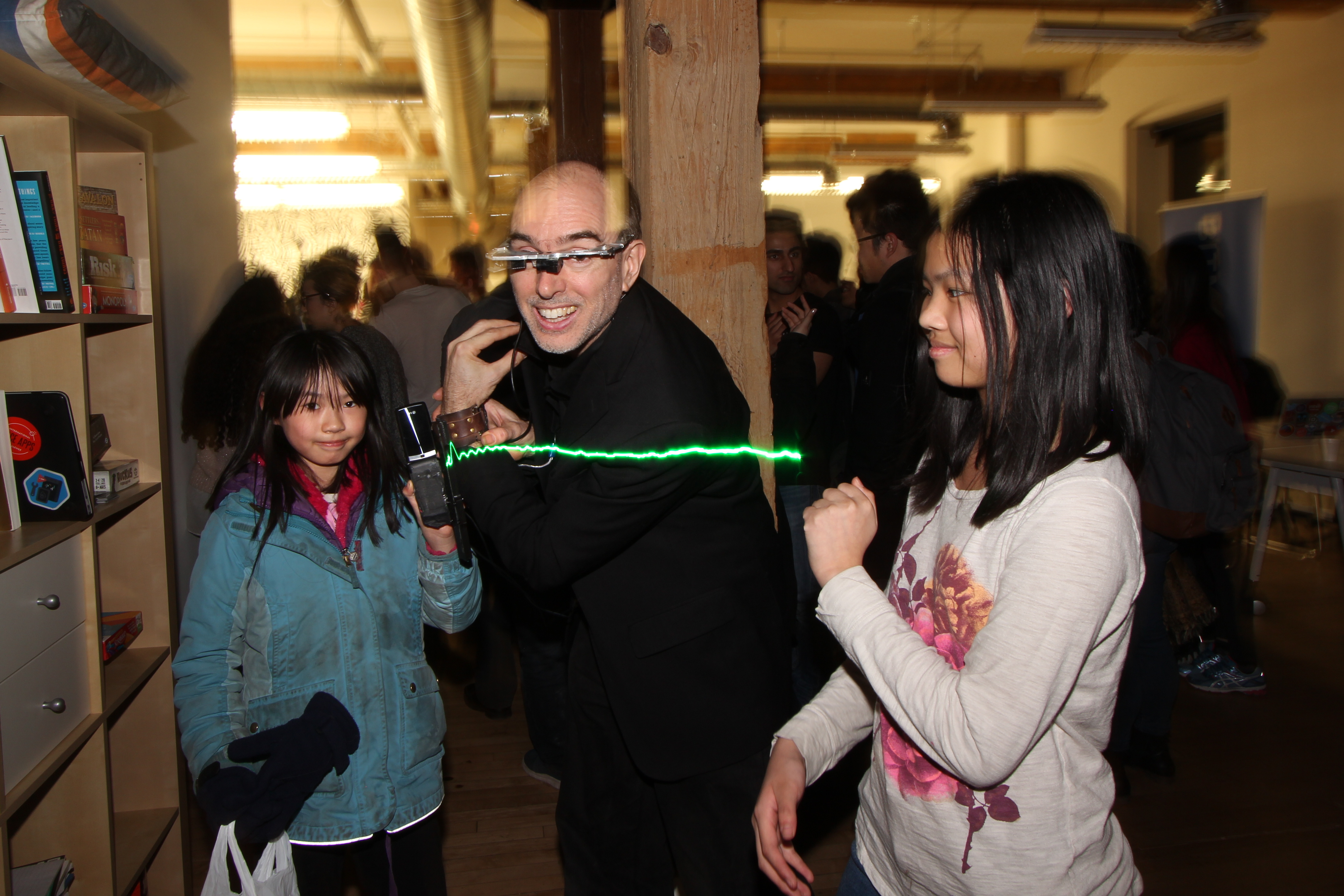 Among many live demos was the S.W.I.M. (Sequential Wave Imprinting Machine) wearable computing and augmented reality system Mann originally built at the age of 12, back in 1974, to measure the speed of light and the speed of sound, and, more importantly, to express radio waves in a coordinate system that moves at the speed of light, with the waves, so as to make them appear to sit still (or at the speed of sound for sound waves), as Phenomenological AR (Augmented Reality) overlays.