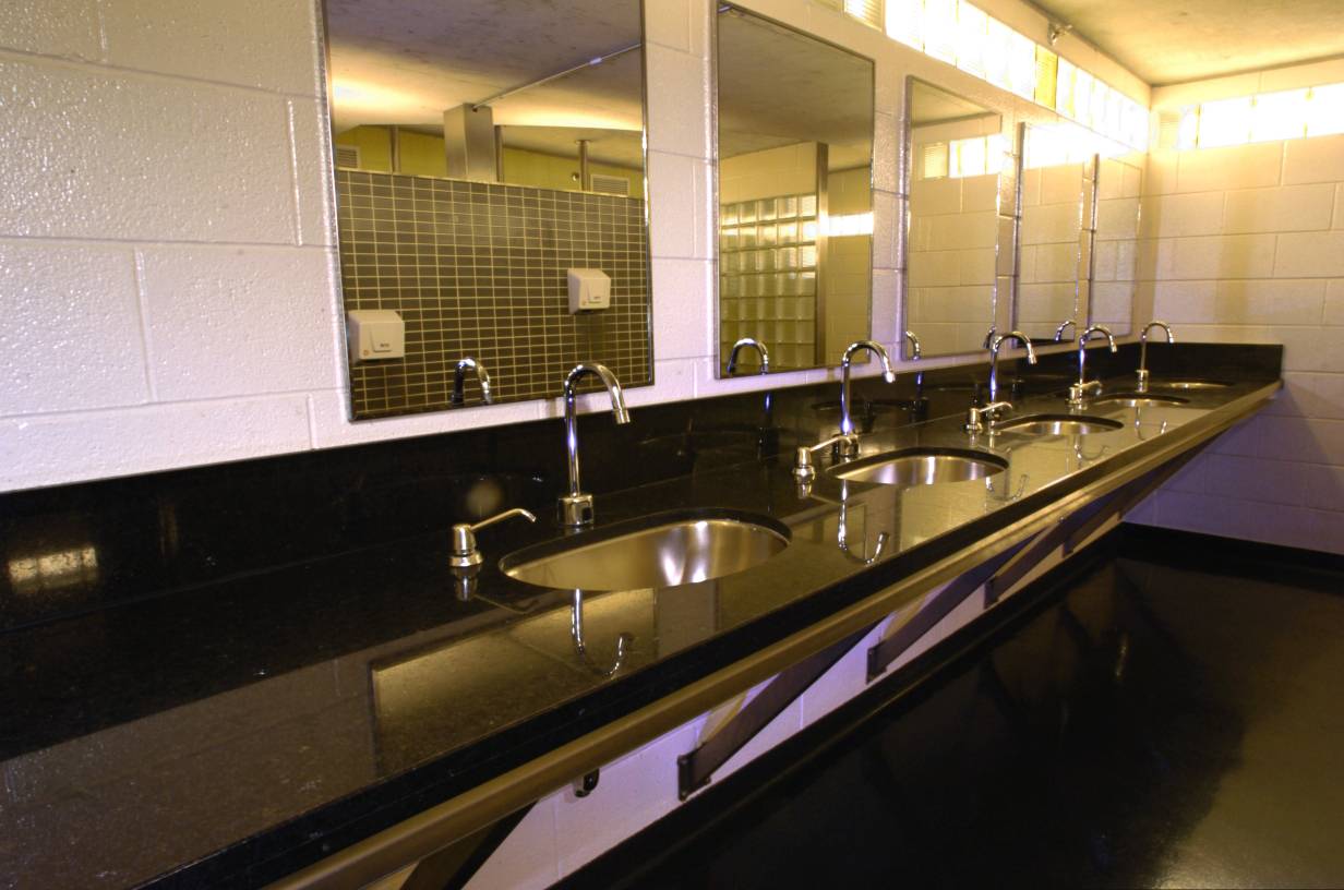 Windows all the way around the outside of the washrooms have lights behind them, to create the illusion of extensive natural light, even though the washrooms are underground. The windows are made of glass brick, permanently cemented in place. Lighting is installed in service tunnels that run around the outside of the washrooms. This provides optimum safety from electrical shock (keeping the lights outside the washrooms), hygiene (no cracks or openings), security (no way for vandals to access the light bulbs), and aesthetics (clean architectural lines that maintain a continuity of the raw industrial urban aesthetic).