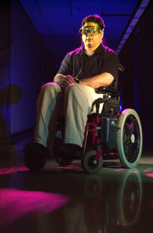 Chris Aimone in the EyeTap wheelchair that drives where the wearer looks: