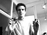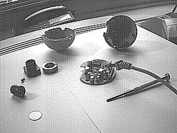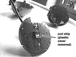 the camera interiour.All the parts you see now can be easily disassembled. Now that you can get a hold on the circuit board, read this warning by Michiel de Rond (michiel@rcd-net.com): "Be very carefull while opening the QuickCam!! Not only do you **VOID** your warranty by Connectix, you also risk damaging your cam (possibly beyond repair!!)" "After we had opened the quickcam, it sometimes yielded very bad images. These images contained excessive static and were in one word unusable. After a few days one of our team-members discovered that a very small SMD transistor had come off the cam while we had opened it. This device is about 1mm x 2mm, so this is easily overlooked." "This time it was possible to fix the cam, and we did manage, but you might damage the cam severely!" Author's comment: This happened with a colour qcam which has a lot more circuitry inside. While this page describes how to disassemble a black & white qcam, I was told by readers that disassembling a colour qcam is not very different. |
