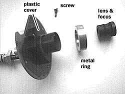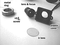 cover that is connected to the circuit board.Well, actually you only have to remove the plastic cover (it's connected to the circuit board with two small screws), but I disassembled the whole thing. (Please note that you have to refocus the qcam if you want to use it as a night-vision device without the ir filter. See above for that.) |