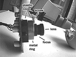 keeping the ball in a whole.A Note by William Lewis (wiml@omnigroup.com): "I'd just like to mention that I've ripped my QuickCam apart a zillion times (the first time I didn't know about the paper-clip-in-the-pinhole trick; I think I was one of the first people to mention it on the mailing list) and have broken off two of the three clips that hold the ball together, but it stays together just fine by friction. So it's not quite the end of the world if you're a little clumsy taking it apart." |